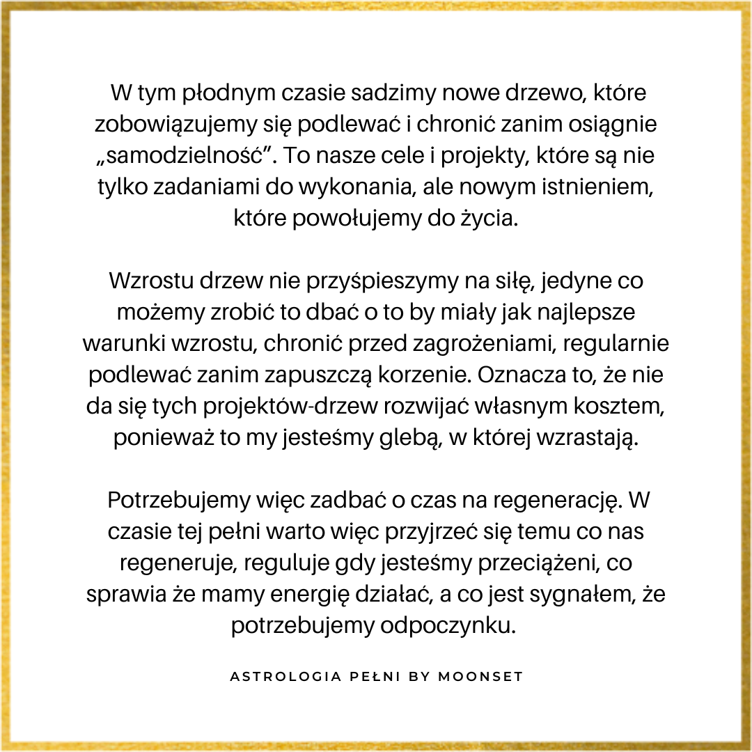 Miesiąc temu pisałam też sporo o metaforze drzewa, które sadziliśmy i pielęgnowaliśmy (przeczytasz więcej o niej na grafikach poniżej). W kontekście niebieskiej pełni na końcówce Koziorożca oznacza to sprawdzenie jak się mają nasze projekty – drzewa? Czy podlewaliśmy je tyle ile potrzebowały, zarówno naszą uwagą i energią, jak i dbaniem o nasze zasoby i ciało – glebę na której wszystkie nasze kreacje mogą wzrastać? Nie chodzi o to by mieć jakiś wyraźny progres, w końcu to był tylko miesiąc, dodatkowo wakacje ;) Chodzi bardziej o to czy pielęgnowaliśmy balans między naszymi działaniami a potrzebami, pomiędzy dbaniem o tą glebę, a dążeniem do Słońca, oraz czy w efekcie czujemy się bardziej osadzeni w działaniu czy przeciwnie przemęczeni? Nawet na urlopie mogliśmy obserwować to napięcie między presją by „robić rzeczy”, wspinać się na metaforyczne i dosłowne szczyty, a potrzebą odpoczynku, odcięcia od bodźców, pobycia w delikatnym zawieszeniu i karmienia się natura i bliskimi relacjami. Oba bieguny są ważne i potrzebne, można je przeplatać i łączyć o ile unikniemy pułapki cenienie tylko jednej strony rzeczywistości i odrzucania drugiej (zazwyczaj raczej „gnuśności” ;) ). To co jest być może wyraźniejsze po tym miesiącu to czym są ściany od których się odbiliśmy w naszych ambitnych planach, a które mają związek z starymi i bardzo starymi historiami (rodowymi, karmicznymi, związanymi z traumą etc). Jeśli się od czegoś takiego odbiliśmy, to nawet jeśli czujemy się jakbyśmy wrócili do punktu wyjścia, to nie jest to prawdą. Zmianą jest nasze zrozumienie tego co stało na naszej drodze i gotowość by otworzyć drzwi na druga stronę muru poprzez konfrontację z przeszłością, emocjami, swoją „słabością” i swoim „byciem silnym zbyt długo”. Pełnia w Koziorożcu, zwłaszcza taka „pogłębiona” jak ta, pyta nas o temat odpowiedzialności w naszym życiu – tej, którą potrzebujemy przyjąć i tej którą potrzebujemy już oddać. To czas uwolnienia od ciężaru zbyt długo niesionego, czy to jako nadmierna odpowiedzialność i uwikłanie w dawne historie i zobowiązania, czy jako wyuczona bezradność i unikanie konfrontacji z czymś.